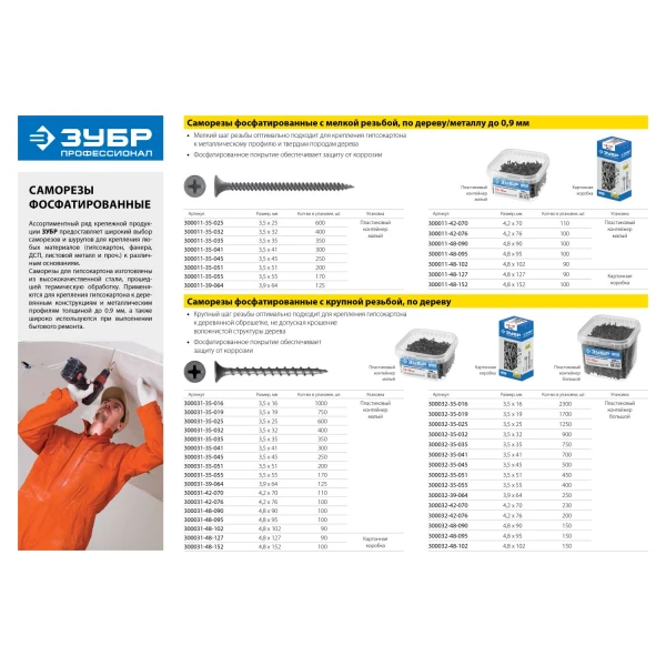 - Резьба с частым шагом разработана для крепления гипсокартона к металлическим профилям.