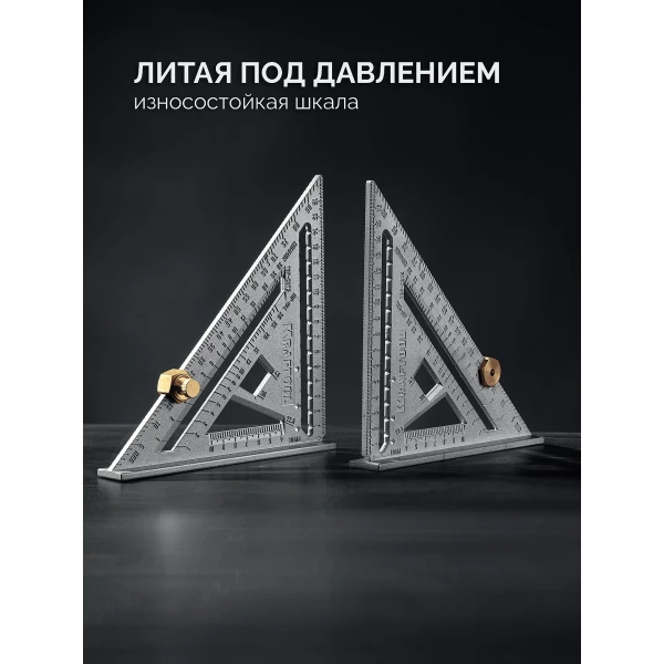 Высокоточный кровельный угольник - инструмент для разметочных работ и контроля перпендикулярности кровельных конструкций. Применяется в качестве торцовочного угольника, транспортира, рейсмуса и направляющей для пилы.