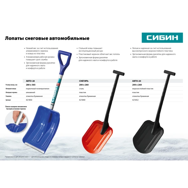 Снеговые автомобильные лопаты СИБИН - оптимальное решение для уборки снега. Малый вес, компактная конструкция и отличные эксплуатационные характеристики делают их незаменимыми в зимний период.