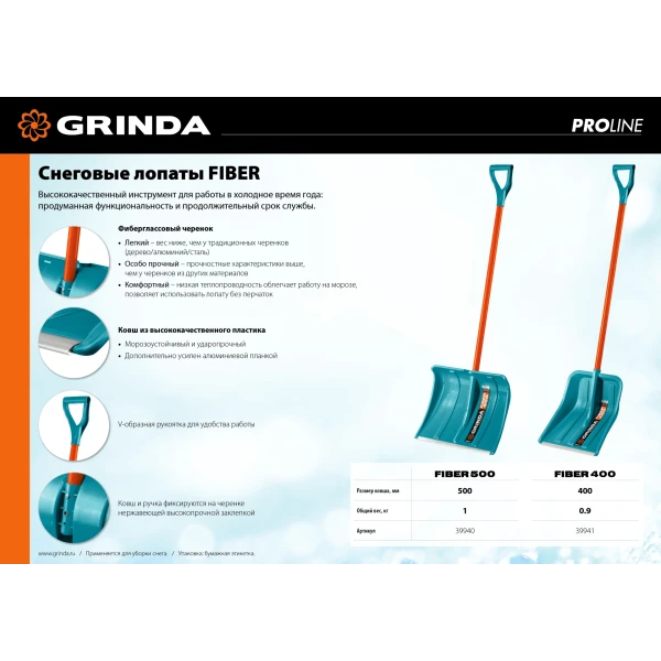 GRINDA FIBER-500, ширина 500 мм, пластиковая, с алюм. планкой, особопрочный легк. черенок из фибергласса, V-ручка, снеговая лопата, PROLine (39940)