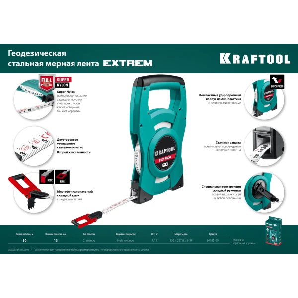 KRAFTOOL 50 м, геодезическая стальная мерная лента (34185-50)