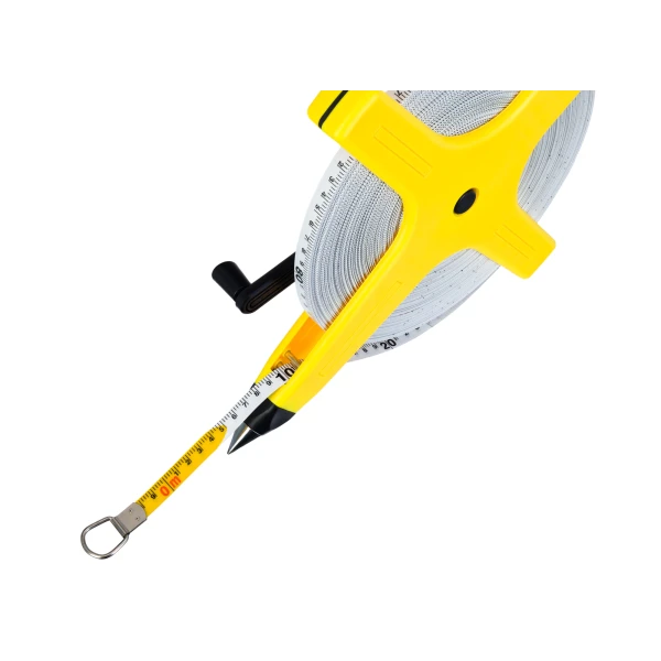Полотно сделано из стекловолокна: этот материал очень износоустойчив, не подвержен растяжению, не покрывается царапинами и заломами во время эксплуатации. К тому же он спокойно выдерживает воздействие воды, поэтому рулетку можно использовать даже во влажных условиях. Шкала на полотне двусторонняя и хорошо читаемая. Для сматывания ленты в корпус применяется боковая ручка, которая имеет блокиратор холостого хода.