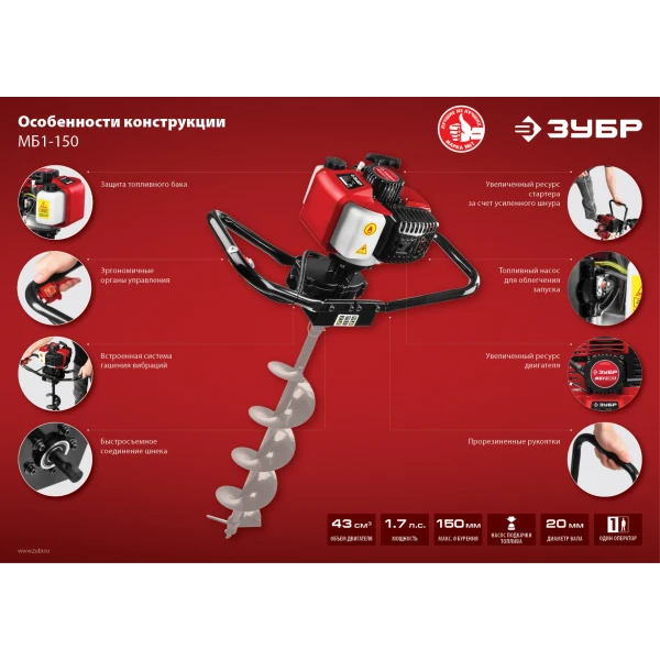 ЗУБР d 60 - 150 мм, 43 см3, 1 оператор, мотобур (бензобур) (МБ1-150)