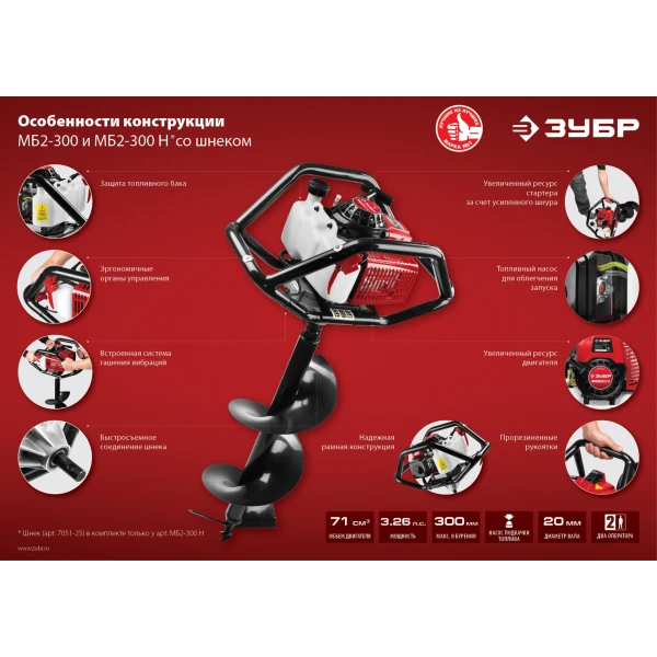 ЗУБР d 60 - 300 мм, 71 см3, 2 оператора, мотобур (бензобур) (МБ2-300)