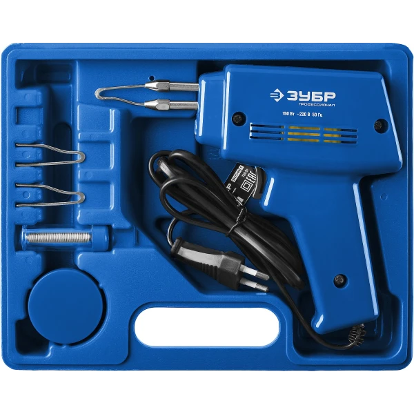 ЗУБР 150 Вт, в наборе: нагрев 6 сек., канифоль, припой, 2 сменных жала, импульсный паяльник, Профессионал (55412-H4)