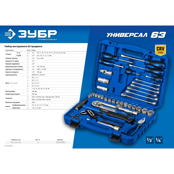 ЗУБР Универсал-63, 63 предм., (1/2″+ 1/4″), универсальный набор инструмента, Профессионал (27670-H58)