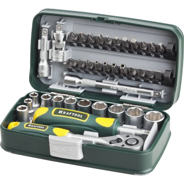 Профессиональный компактный набор слесарно-монтажного инструмента KRAFTOOL изготовлен из высококачественной хромованадиевой стали. Биты и торцовые головки отличаются тщательно закаленными рабочими поверхностями, что обеспечивает высокое качество выполнения работ и длительный срок службы. Используются с ручным и механизированным инструментом.