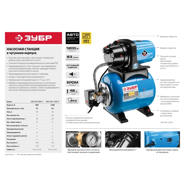 ЗУБР 1200 Вт, бак 20 л, автоматическая насосная станция, чугунный корпус (НАС-М3-1200-Ч)
