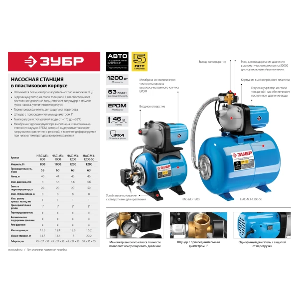 ЗУБР 800 Вт, бак 20 л, автоматическая насосная станция (НАС-М3-800)