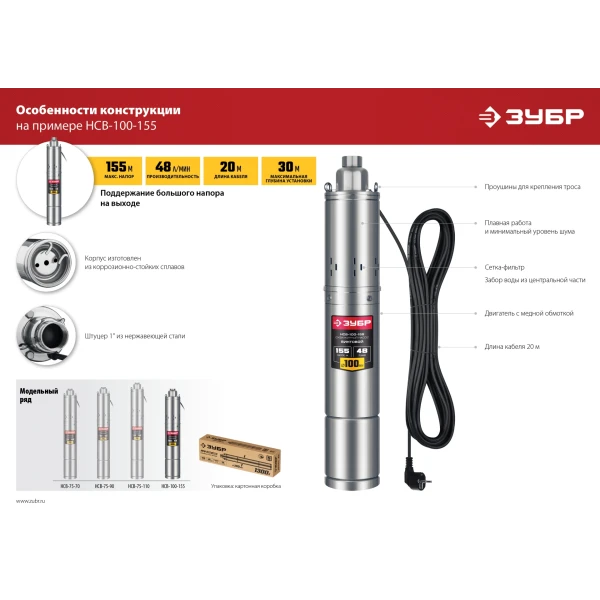 ЗУБР 370 Вт, 70 м напор, скважинный насос винтовой, корпус из нержавеющей стали (НСВ-75-70)