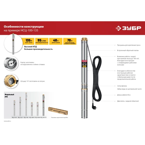 ЗУБР 550 Вт, 40 м напор, скважинный центробежный насос, корпус из нержавеющей стали (НСЦ-100-40)