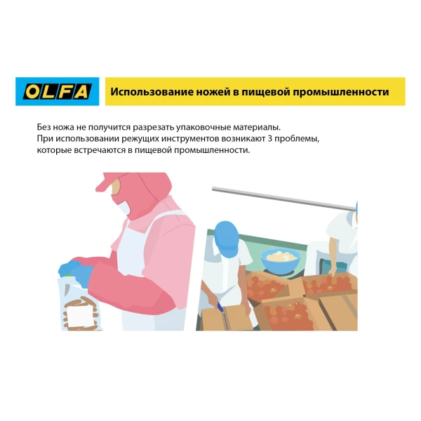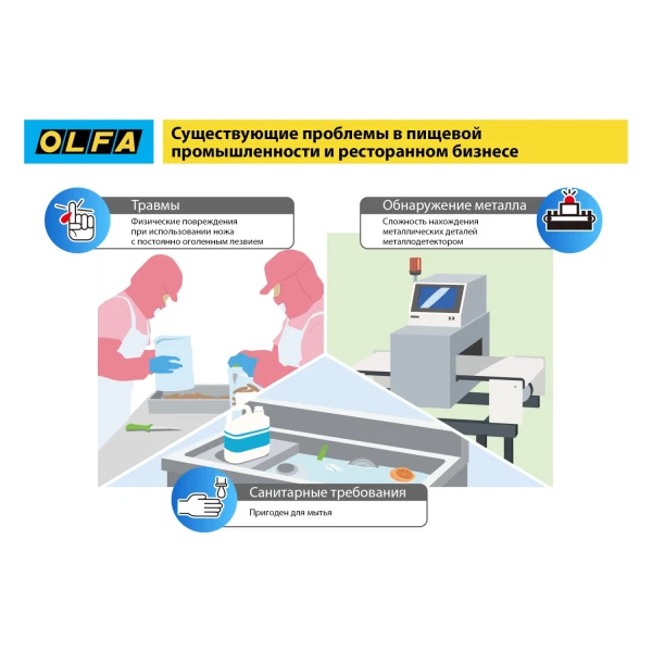 Нож OLFA SK-12 специально разработан для применения в пищевой промышленности и ресторанном бизнесе. Сертифицирован NSF благодаря возможности легко поддерживать его в чистоте любыми методами и составами, в том числе дезинфекция гипохлоритом натрия, за счет конструкции и лезвию SKB-2S из нержавеющей стали. Также, нержавеющая сталь обладает высоким коэффициентом намагничивания, что обеспечивает ножу более высокую точность нахождения металлодетекторами, чем у обычных ножей с пластиковыми рукоятками.