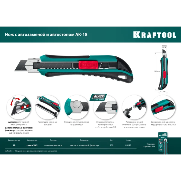 KRAFTOOL Uni, 18 мм, нож с сегментированным лезвием (09193)