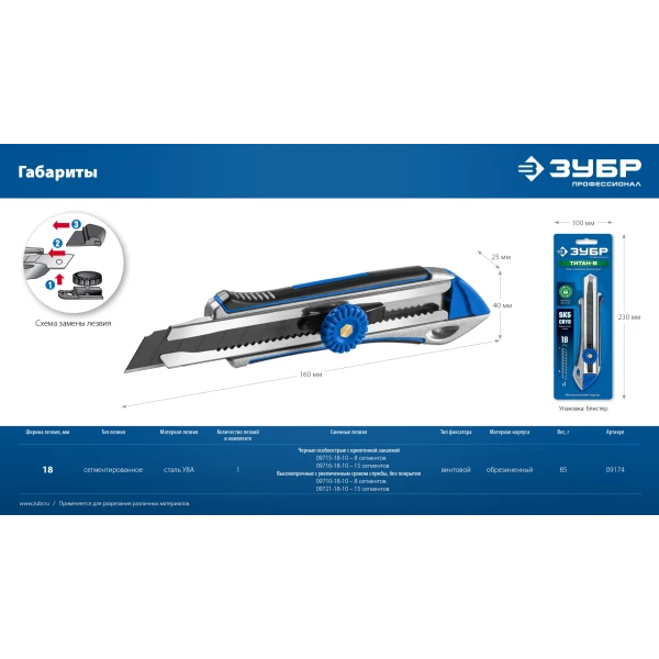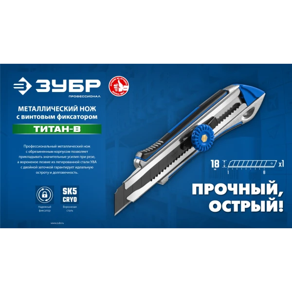 ЗУБР Титан-В, 18 мм, металлический обрезиненный нож с винтовым фиксатором, Профессионал (09174)