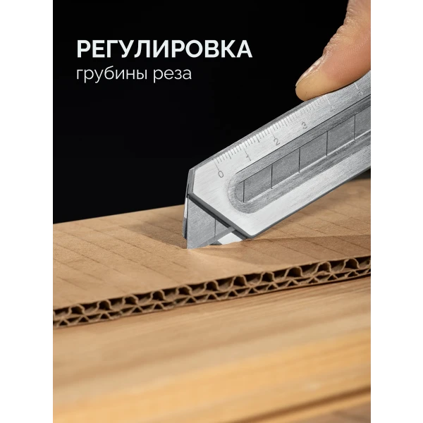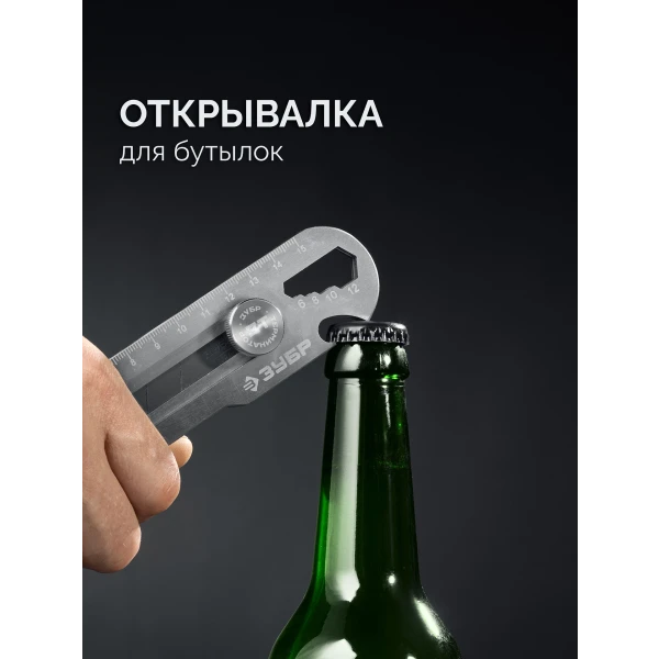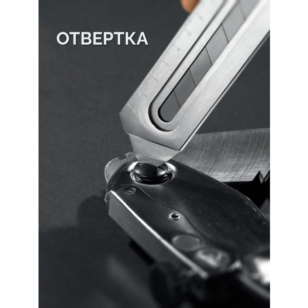 Применяется в качестве ножа с регулировкой глубины реза, линейки, отвертки, открывалки, гаечного ключа