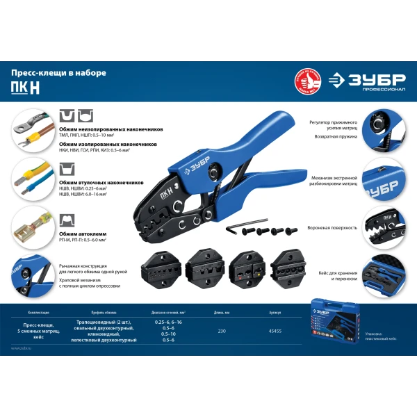 ЗУБР ПК-Н, 5 матриц в кейсе, пресс-клещи для кабельных наконечников, Профессионал(45455)