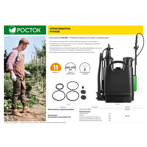 РОСТОК RK-11, 11 л, с телескопическим удлинителем, ранцевый опрыскиватель (425219)
