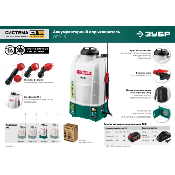 ЗУБР 15 л, 1 АКБ 4 А·ч, аккумуляторный опрыскиватель (ОПЛ-15-41)