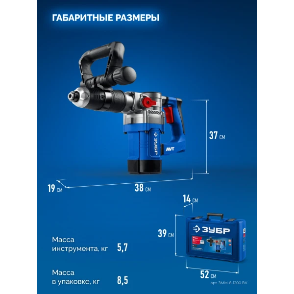 Отбойный молоток ЗУБР ЗММ-8-1200 ВК (8 Дж, 1200 Вт, SDS Plus) – профессиональный инструмент с АВТ