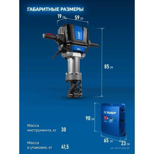 ЗУБР Бетонолом, 70 Дж, 2500 Вт, АВТ, отбойный молоток HEX-28, Профессионал (ЗМ-70-2500 ВК)