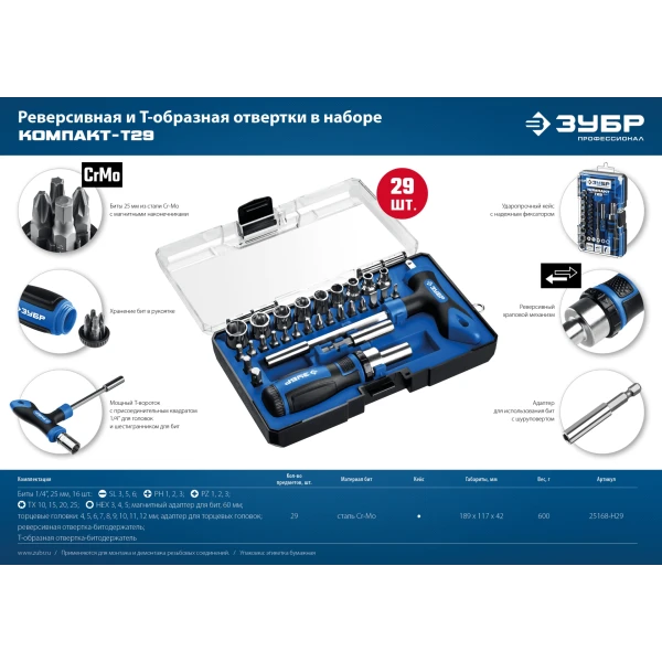 Профессиональный компактный набор с реверсивной отверткой для работы как с ручным так и с электроинструментом