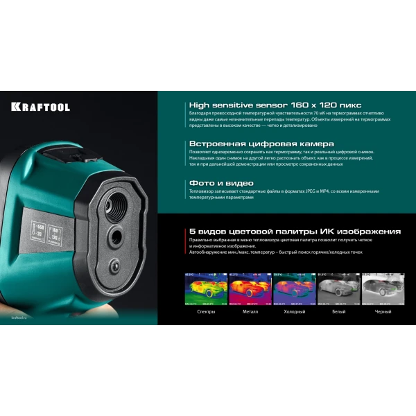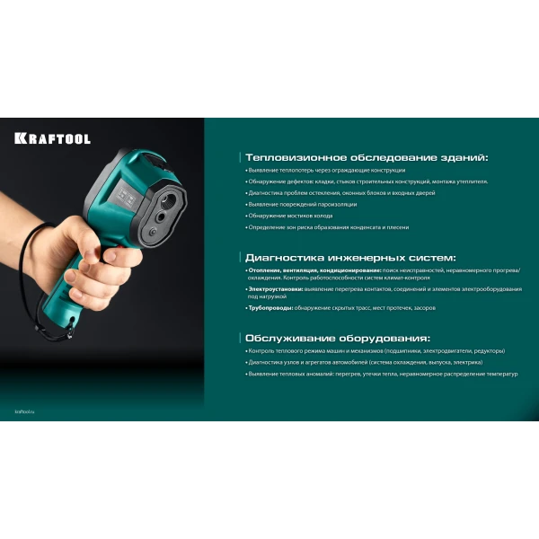 Тепловизоры KRAFTOOL обеспечивают точное обнаружение и локализацию утечек или дефектов ограждающих конструкций, незаменимы для профилактического и предупредительного обслуживания, диагностики состояния зданий и помещений.