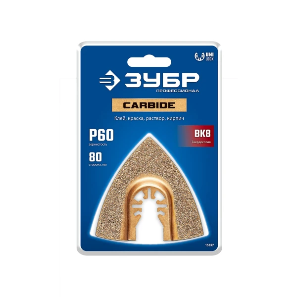 ЗУБР CARBIDE ВК8 Р60, 80 мм треугольное полотно с твердосплавной крошкой: твердое дерево, строительный раствор, клей, UniLock (15557)
