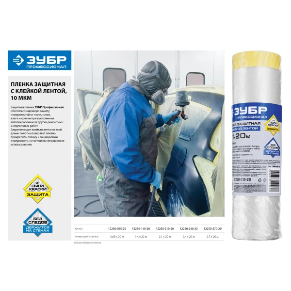 Пленка ЗУБР обеспечит надежную защиту поверхности от пыли, грязи, влаги и краски при выполнении автопокрасочных и других ремонтных и отделочных работ. Закрепляющая клейкая лента по всей длине полотна позволяет плотно прикрепить пленку к защищаемой поверхности, не оставляя следов после использования. ЗУБР - выбор профессионала