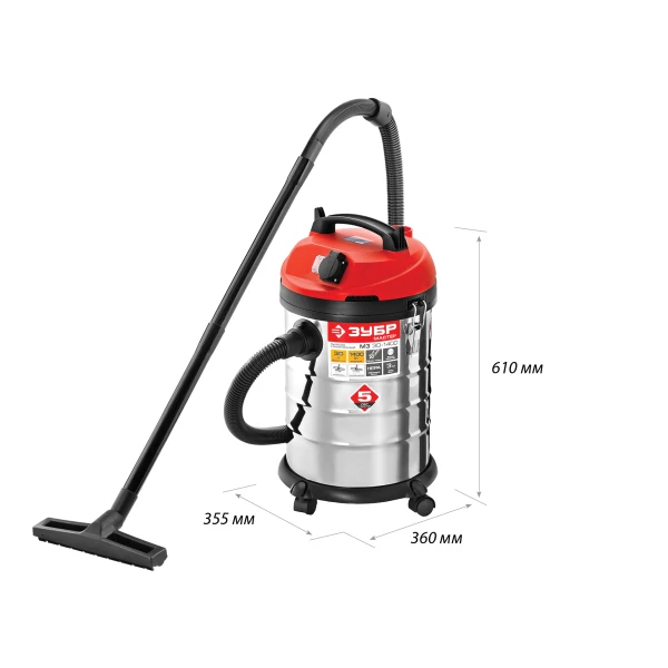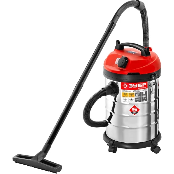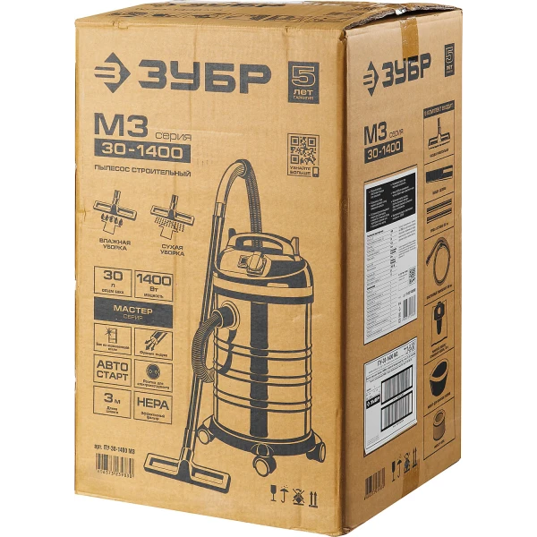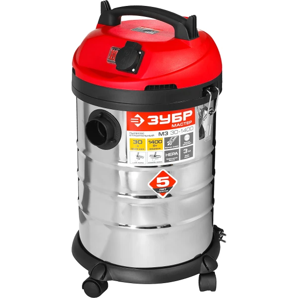 Строительный пылесос ЗУБР предназначен для уборки помещений, а также для принудительного удаления продуктов пиления, строгания, фрезерования и т.п. из рабочей зоны электроинструмента. Он незаменим для поддержания чистоты в гараже, мастерской, удаления мусора во время ремонта в квартире или на даче. Бак из нержавеющей стали объемом 30 л очень долговечен. а синхронное включение с инструментом, подключенным через розетку пылесоса позволит сохранить чистоту на рабочем месте.