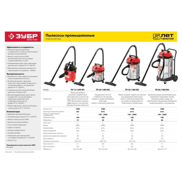 - - Возможность влажной уборки и сбора жидкости делают пылесос ЗУБР универсальным с широким спектром применения,