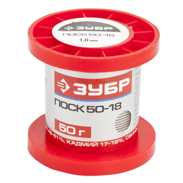 Припой оловянно-свинцовый с кадмием ПОСК 50-18 ЗУБР, арт.55454-050-10,серия ″Мастер″, применяется для пайки деталей, чувствительных к перегреву – металлизированной керамики, полупроводниковой техники, медных и медно-никелевых сплавов с посеребренной керамикой, посеребренных деталей, ювелирных изделий, ступенчатой пайки конденсаторов.