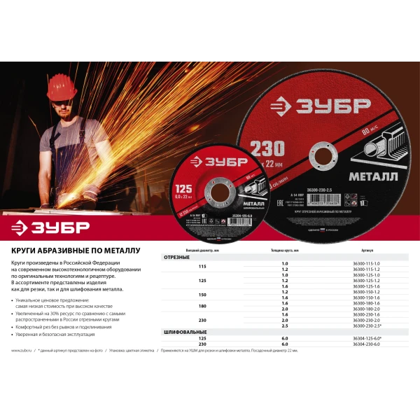 ЗУБР 180 x 2.0 х 22.2 мм, для УШМ, круг отрезной по металлу (36300-180-2.0)