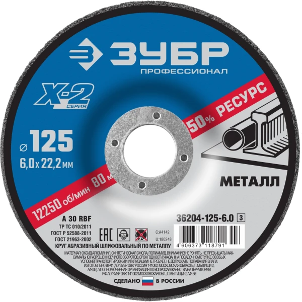 ЗУБР Х-2, 125 х 6 х 22.2 мм, для УШМ, шлифовальный круг по металлу, Профессионал (36204-125-6.0)