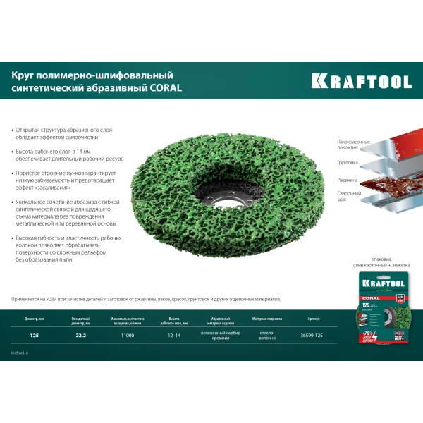 Синтетические полимерно-шлифовальные круги KRAFTOOL обладают максимально возможной производительностью при зачистке металла и древисины от ржавчины, засторелых лакокрасочных покрытий, грунтовок и других отделочных материалов.
