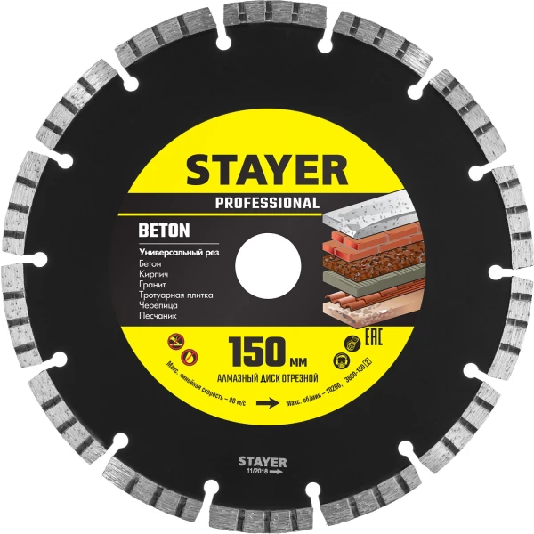 STAYER BETON, 150 мм, (22.2 мм, 7 х 1.9 мм), турбо-сегментный алмазный диск, Professional (3660-150)