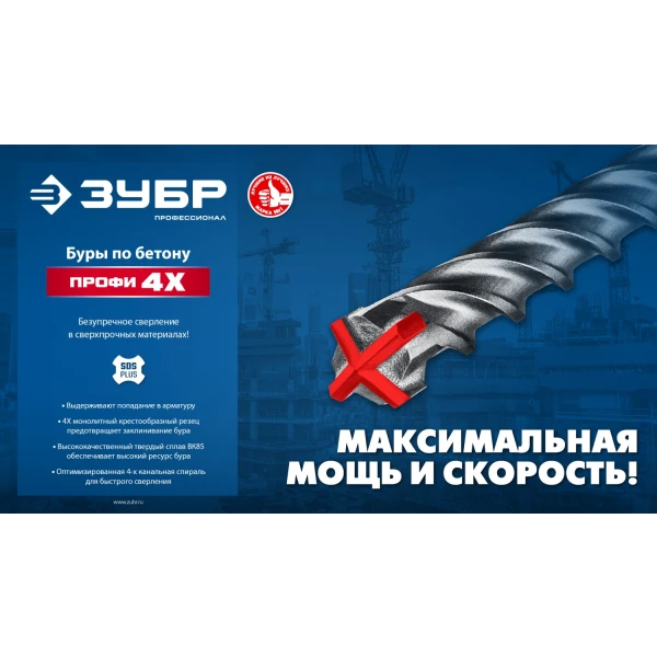 - Геометрическая форма наконечника с 4 кромками предотвращает заедание и поломку, обеспечивая эффективное сверление даже железобетона.