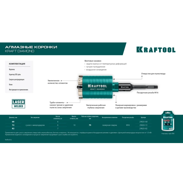 KRAFTOOL DIAMOND d 68 мм (М16, рабочая глубина 75 мм, лазерная сварка), Алмазная Коронка для подрозетников (29820-68)