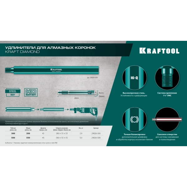 KRAFTOOL L500 мм, стальной, посадка 1 1/4″, Удлинитель для алмазных коронок (29826-500)