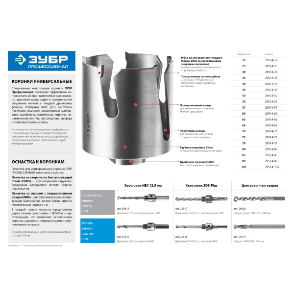 Универсальная коронка ЗУБР ПРОФИ это многофункциональный инструмент, решающий разнообразные задачи сверления при проведении строительных и ремонтных работ.