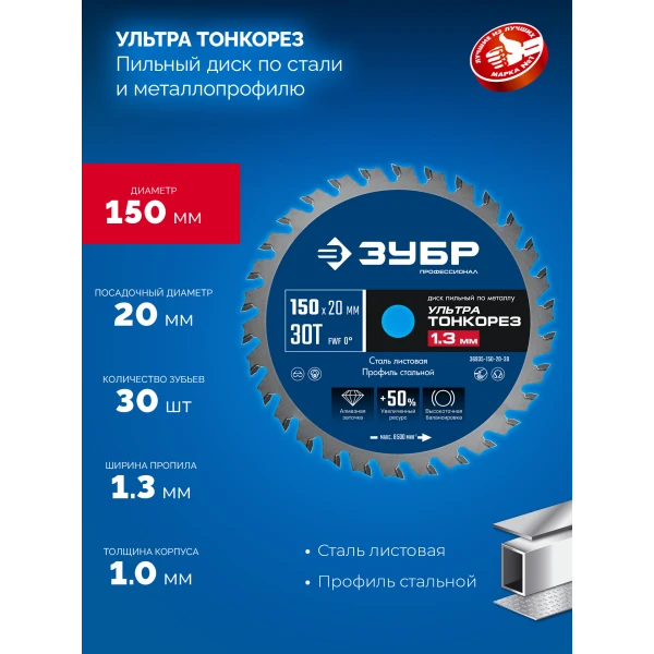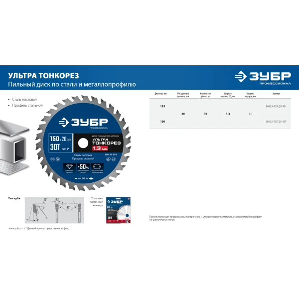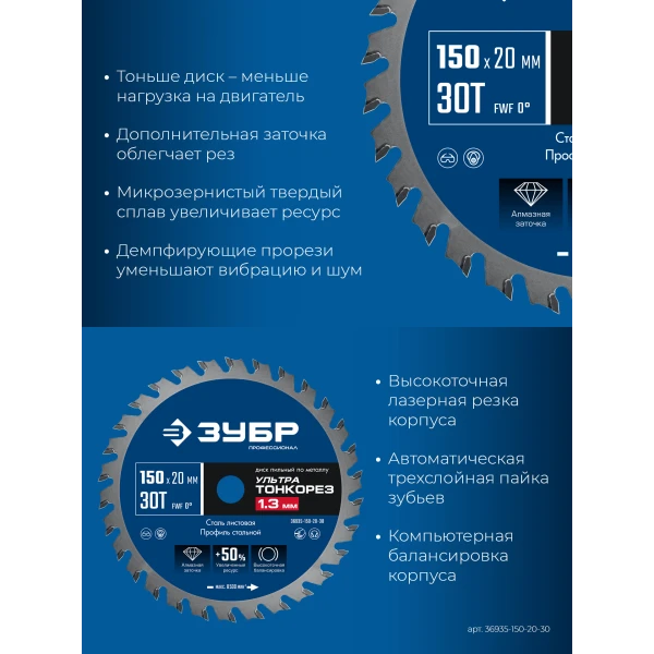 ЗУБР Ультра Тонкорез 150 х 20 x 1.3 мм, 30Т, диск пильный тонкий рез металла, Профессионал (36935-150-20-30)