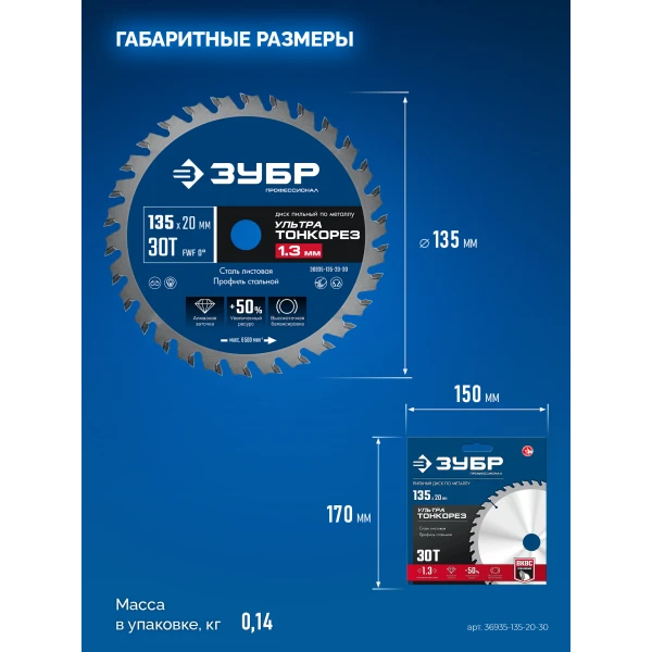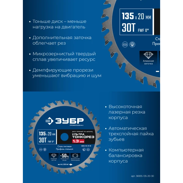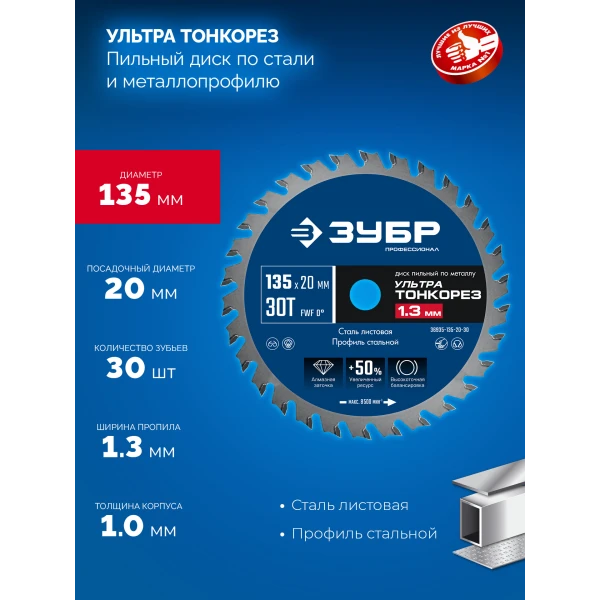 ЗУБР Ультра Тонкорез 135 х 20 x 1.3 мм, 30Т, диск пильный тонкий рез металла, Профессионал (36935-135-20-30)
