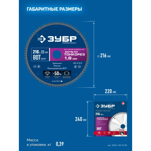ЗУБР Мульти Тонкорез 216х30 x 1.8 мм, 80Т, диск пильный универсальный, тонкий рез, Профессионал (36934-216-30-80)