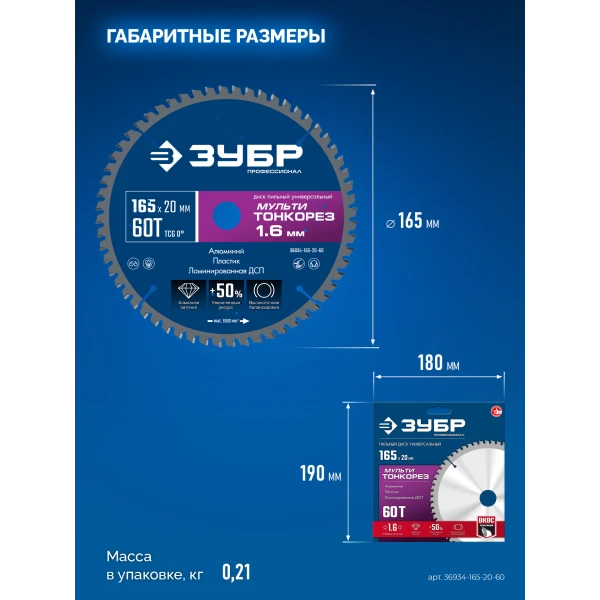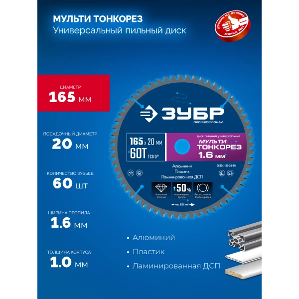 ЗУБР Мульти Тонкорез 165х20 x 1.6 мм, 60Т, диск пильный универсальный, тонкий рез, Профессионал (36934-165-20-60)