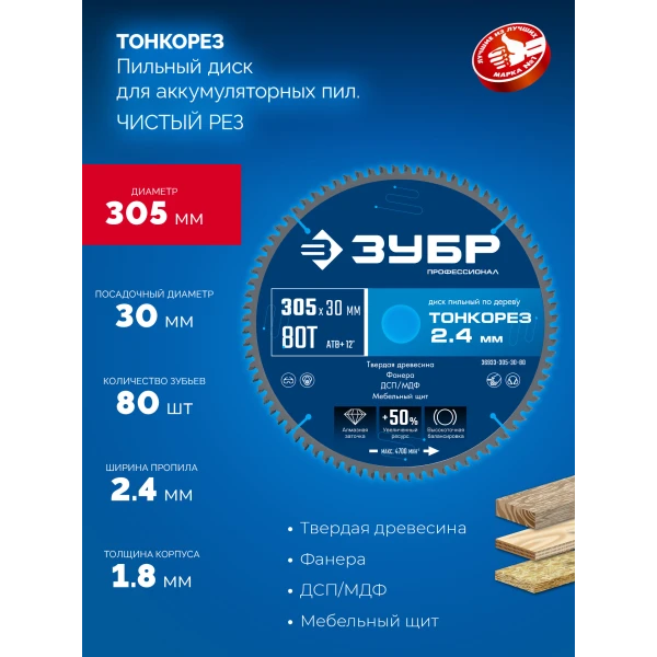 ЗУБР Тонкорез 305х30 x 2.4 мм, 80Т, диск пильный по дереву, тонкий рез, Профессионал (36933-305-30-80)