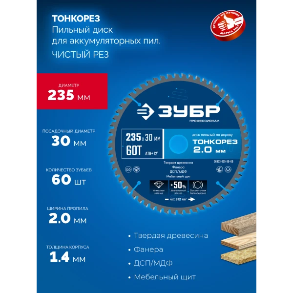 ЗУБР Тонкорез 235х30 x 2.0 мм, 60Т, диск пильный по дереву тонкий рез, Профессионал (36933-235-30-80)