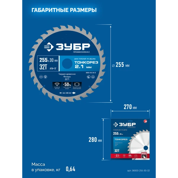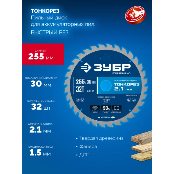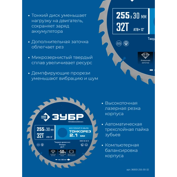 ЗУБР Тонкорез 255х30 x 2.1 мм, 32Т, диск пильный по дереву тонкий рез, Профессионал (36933-255-30-32)