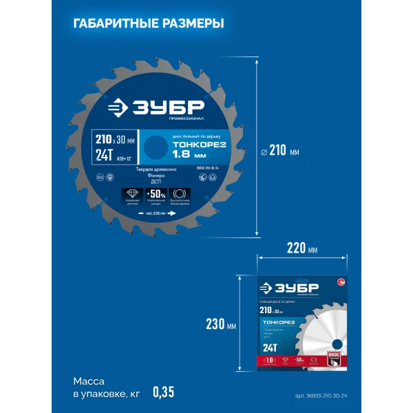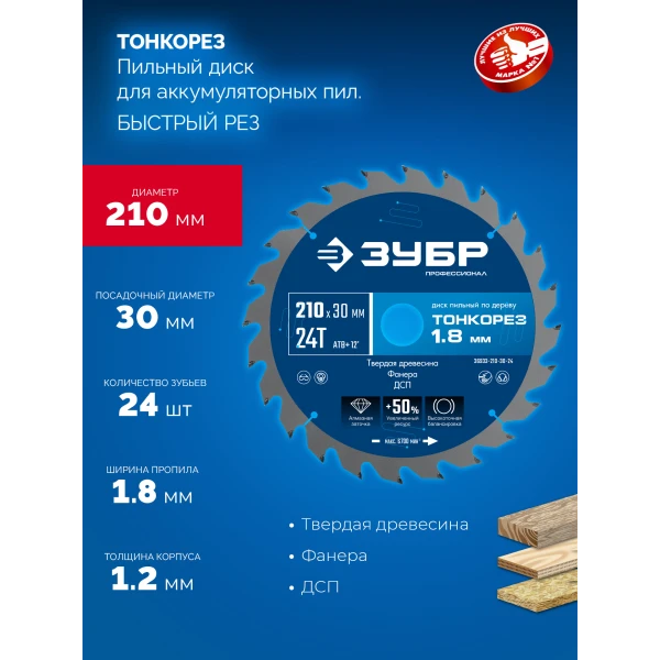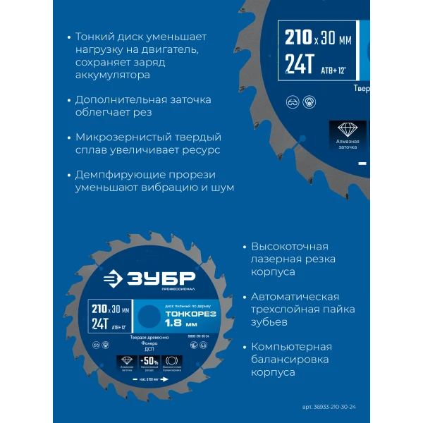 ЗУБР Тонкорез 210х30 x 1.8 мм, 24Т, диск пильный по дереву, тонкий рез, Профессионал (36933-210-30-24)