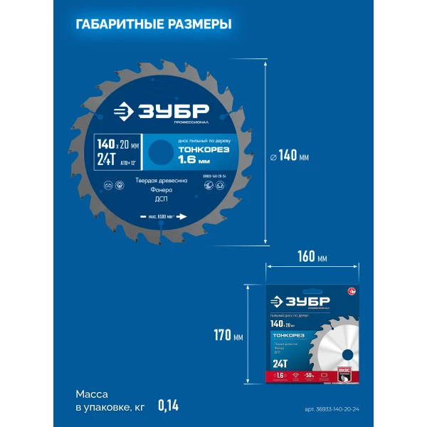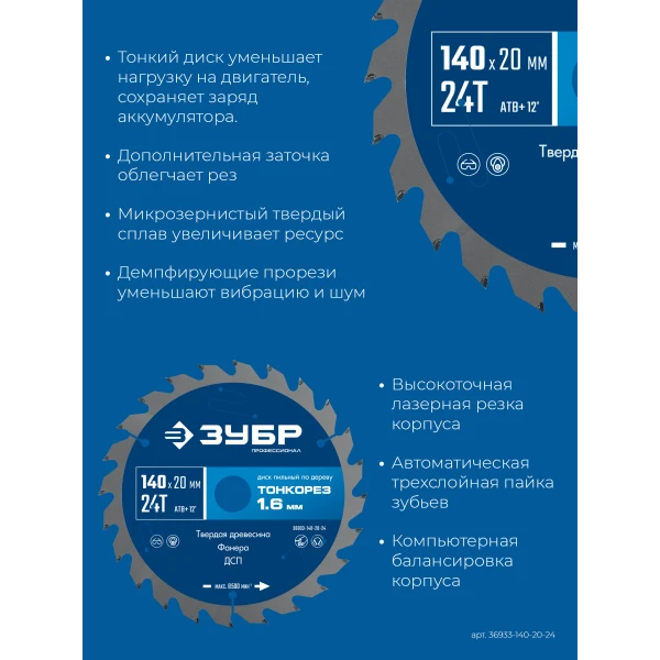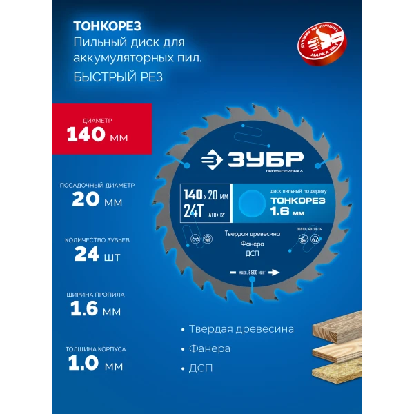 ЗУБР Тонкорез 140х20 x 1.6 мм, 24Т, диск пильный по дереву, тонкий рез, Профессионал (36933-140-20-24)