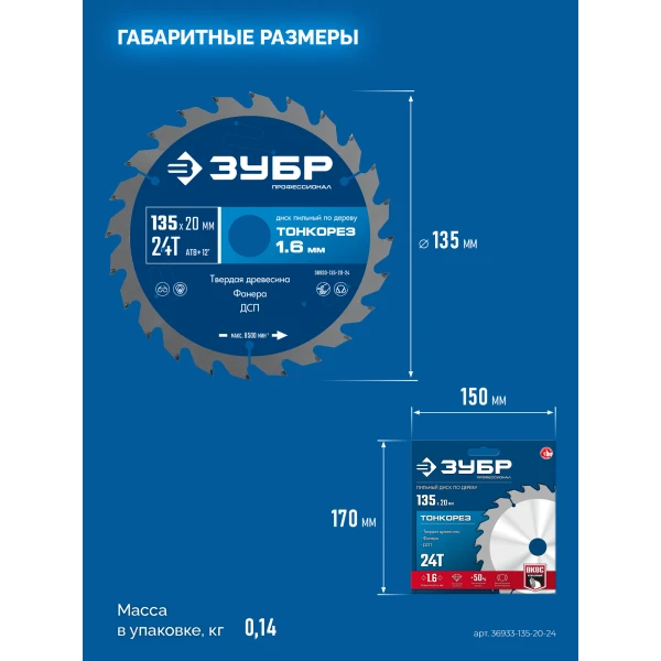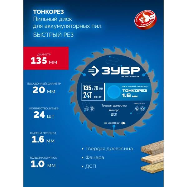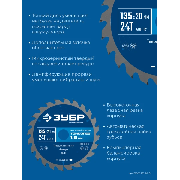 ЗУБР Тонкорез 135х20 x 1.6 мм, 24Т, диск пильный по дереву, тонкий рез, Профессионал (36933-135-20-24)