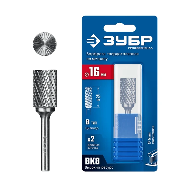 ЗУБР 16х25 мм, тив B (цилиндр с торцевыми зубьями), хв-к 6 мм, твердосплавная борфреза, ПРОФЕССИОНАЛ (28801-16-25)